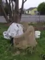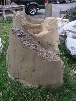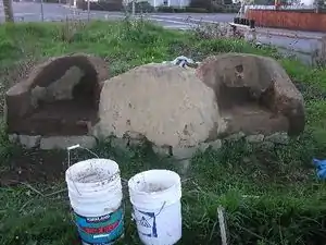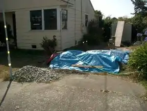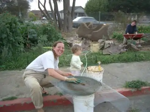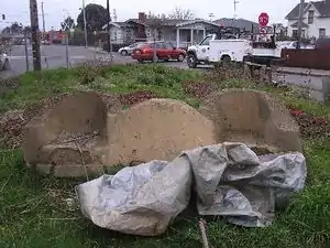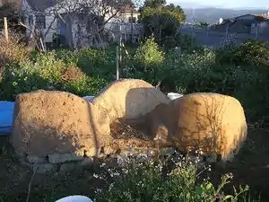 McAuley and crew gathered materials for the construction of the bench around the city of Arcata. Reclaimed urbanite (broken chunks of sidewalk) was collected from HSU with the intention of being used as the foundation (see fig. 1). Materials for the construction of the cob and plaster were collected locally and kept in the yard of Lisa Jackson (see fig. 2).