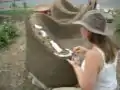 Since the plaster batches were smaller than cob batches they mixed the plaster in a wheelbarrow (see fig. 16) and then applied it to the bench using a trowel (see fig. 17). Before a layer of plaster is applied to the cob bench it is advised to wet down the cob surface and then smear it with some clay slip. Clay slip is simply super saturated clay (see fig. 18). Applying water and clay slip to the cob bench before applying plaster helps the clay and plaster bond together. To give the plaster a smooth finish McAuely and Thompson applied their plaster in an up direction. They smeared plaster on the wall near the bottom and smeared it in an upward direction (see fig. 17).