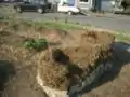 In February of 2007 the bench was in bad shape. The bench had suffered from the elements and was in a dilapidated condition (see Figs. 1a, 1b). A previous group attempted to repair the bench in 2006. They removed the original tiles placed at the top of the bench but they never replaced them. Leaving the tiles off the top of the bench exposed unprotected cob to the elements and by February 2007 the top of the bench had suffered major erosion (see Fig. 2a).