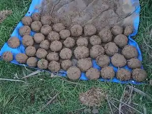 The original cob group led by Patrick McAuely appears to have followed this method when making their cob. After they mixed the cob to the proper consistency they rolled the cob into balls the size of melons (see figs 5 and 6) and transported them by hand to the foundation (see fig 7).