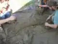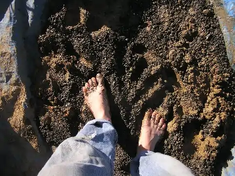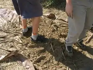 McAuely and the rest of his cob group used the standard method of making cob, foot power. They laid down river sand and then the clay on a tarp, added water to the mix to saturate it and began to mix it all together by foot (see fig. 4). It helps to lay the sand down first as it acts like a flour on the tarp and prevents the clay from sticking to it. During the mixing it helps the process move faster if two ends of the tarp are occasionally lifted together. This folds the cob like a burrito and allows for better mixing.