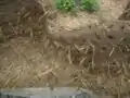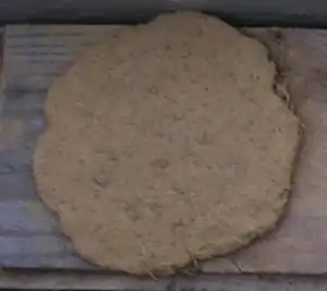 Once the sand and clay stick together sufficiently straw is added to the mix. A finished cob mix consistency should be such that if it is folded it will stick together (see fig. 5). An easy consistency test to perform is to roll a small ball out of the mixture and hold it in your hand. Then, without pinching your fingers together, pull your hands apart. If the mixture does not break apart easily it is of the proper consistency. You can also drop the mixture from shoulder height and let it hit the ground. If the mixture flattens it requires more sand, if it cracks, it requires more clay.
