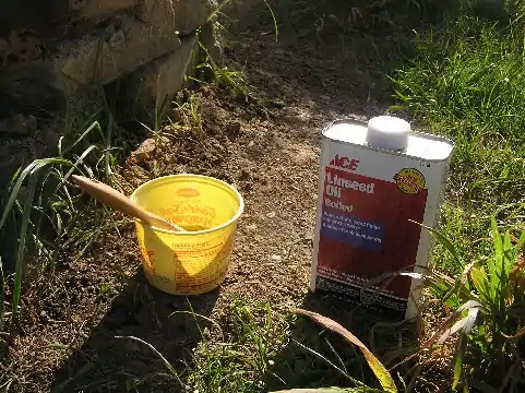 Boiled linseed oil (as opposed to regular linseed oil) is great to apply to cob structures, as it is natural oil that comes from the flax seed, it has a fast dry time and it is good at protecting structures from water damage. It’s better to use boiled linseed oil as it dries faster than non-boiled linseed oil.