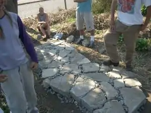 After the group laid down river rock they placed pieces of urbanite on top. The gaps between the urbanite were filled with more river rock (see fig. 3). The group ended up applying two layers of urbanite and this served as their foundation.
