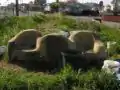 As noted in the introduction, the old plaster was removed from the bench before the new plaster was applied. The removal of the old plaster was a fairly easy task as most of it was already falling off. A putty knife was used to take off the majority of the plaster. Some sections of plaster were left untouched as they were in good condition and did not want to be removed easily (see figs 19a, 20a).