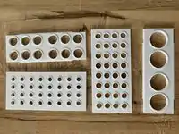 4-way Interlocking Tube Rack | Commercial equivalents can run $10 to $15 each (based on Fisher Scientific) | Designed in OpenSCAD, this print costs about $5 total in PLA and fits together without any part cleaning | |