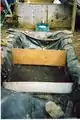 Once the hole was dug we used two pieces of pond liner to cover the hole and placed rocks along the outside to hold the pond liner in place (see Fig 6). Then we installed one and a half baffle systems, which were made of plywood (see Fig 7). The first baffle system was placed three feet from the inlet pipe, and the half baffle was near the end before the outlet pipe. The first baffle is flush to the bottom of the marsh and the second baffle sits on bricks. The last baffle is flush with the bottom of the marsh as well (see diagram in Fig 5). Getting the baffles to stay in place was a task. We carved grooves in the wall of the hole and slid the baffles down into the slot. To make this process easier we cut the corners off the bottom ends of the baffles, this helped prevent ripping of the pond liner. Lastly we packed mud around the outside of the baffles, under the pond liner. This method worked well, making the baffles very solid and secure.