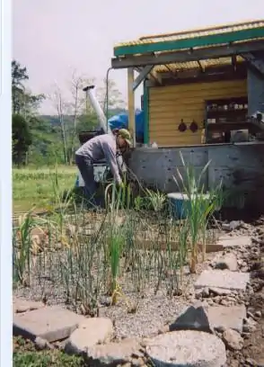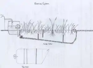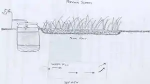 Our design is also a constructed wetland, but it is much larger and has a functional settling tank and an outlet that waters a nearby apple tree. The design we chose was based on the small amount of greywater generated on a weekly basis on site. In the book "Create an Oasis with Greywater", Art Ludwig provides a source estimation guide. He approximates that with conservation a kitchen sink will use five gallons of water per day, per person. This means that with two farmers using the kitchen sink everyday they would produce 70 gallons of water per week. We also took into consideration volunteers and interns on the farm, and estimated that with one volunteer per day, it would add another 35 gallons a week to the total. In addition we calculated the use of the kitchen by the Community Agriculture class on Friday, and estimated a total of fifteen students. This adds another 75 gallons of water used per week. Finally we calculated the water needed to wash vegetables during the climax of the season and calculated a total of 20-30 gallons per week. The grand total of water used at the Arcata Educational Farm equates to approximately 200 gallons of greywater produced per week. For the amount of water used per week at the farm, a constructed wetland design best fit our project.