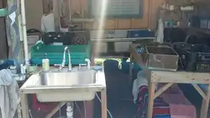 In overview, the system required too much work to refurbish and the farm had plans to expand the storage shed/kitchen area by adding a wash station. The final call was made. The greywater system was removed and the wash station was constructed. Below you will find two photographs ( Fig. 14 & Fig. 15) of the current state of the new wash station were the greywater system used to sit.
