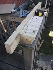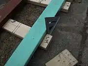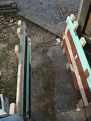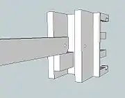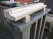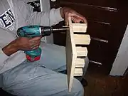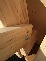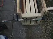 - Attach both pistons to the piston head by placing a carriage bolt or axle in between the two pieces. Washers should be used at all interfaces (between wood and nuts). A scrap piece of wood should be put directly under the pistons once attached. This stops the piston head from falling over. Alternatively if bolts, nuts and washers are not available, the piston can be directly attached to the piston head. This removes the pivoting feature.