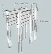 - Construct the two chamber sides. Piece 2, the side support, is on the opposite side for the second chamber side. Otherwise the two pieces are identical. There is also a 1/2" gap in between pieces. In the recommended drawings, the side supports were increased to mid height on an average man. This allows the user to stand up during baling and tying, reducing the amount of stress on the user’s back.
