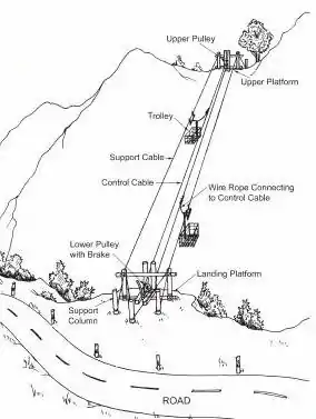 The gravity ropeway is an inexpensive and simple means of transportation. It operates by gravitational force without the use of external power. The gravity ropeway consists of two trolleys which roll on support tracks. These are attached to a control cable in the middle which moves in a traditional flywheel system. When the loaded trolley at the up-station is pulled downward by the force of gravity, the other trolley at the bottom-station is pulled up automatically by means of the control cable. In principal the goods coming downward from the up-station must to be thrice as heavy as the up-going load. The sliding down of the trolley and its speed depends upon the angle of elevation made by the cables installed with the horizontal ground.