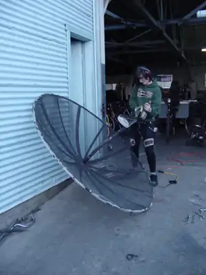 At first, I was open to anything to construct the solar cooker. I was thinking about constructing my paraboloid out of cobb and then sticking small pieces of glass into it as I've seen others do. However, it takes a lot of time to collect the cobb materials and build a paraboloid out of it, let alone one whose focus was accurate. A donated dish was viable, but would not have the heat capacity I was going for, so I set out to find another dish. While rummaging around Arcata Scrap and Salvage one day, I came across an old mesh satellite dish and I knew I had found my cooker. My mentor Bart Orlando and I hauled it to the Bike Library where my cooker began to take shape.