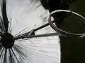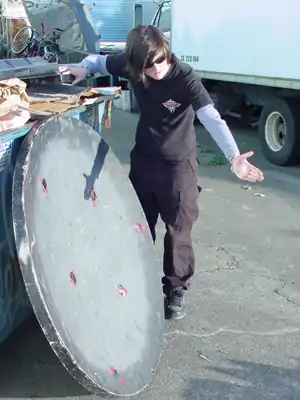 We began the project by testing a dish that Bart had at the Bike Library. It was slightly oblong and wasn't concave much, so we decided to test how accurate the focus was. I taped a few pieces of mylar on it and Bart and I took it out into the sun. It turned out that the dish had many foci because of its' oblong shape. I had to set out to find another dish if I wanted to be able to fry food with it. The one we had just wasn't going to cut it. That's when I made a trip to Arcata Scrap and Salvage and found the perfect dish for my project.