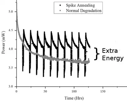 Normal degradation at PV operating temperatures vs spike annealing in a PVT. The electrical performance of the a-Si-based PV in the PVT is 10% better than in standard PV