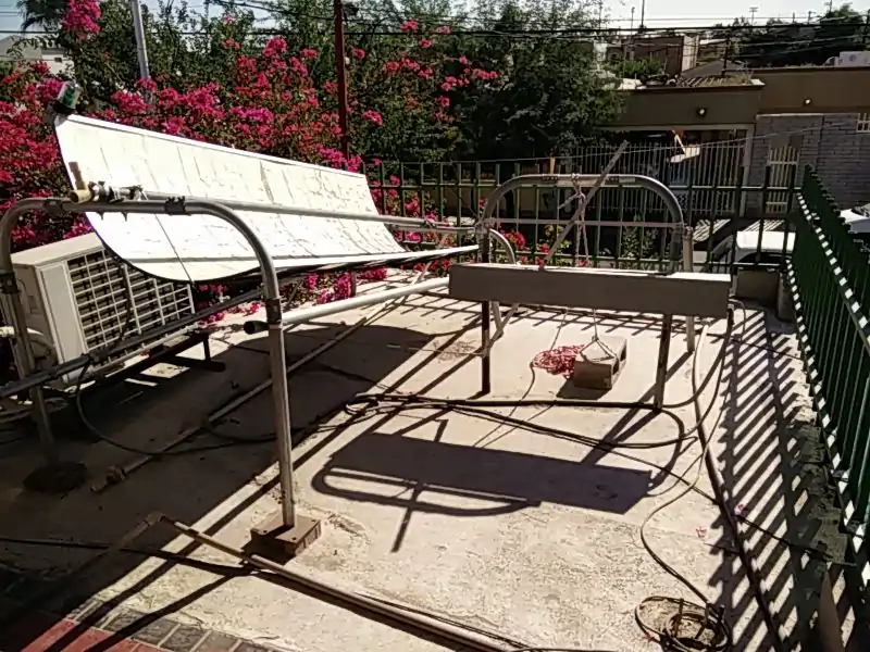 Our most recent experiment for fabricating the parabola bed was to use a sheet of plastic PET, with the aluminized Mylar underneath it and to protect the PET, we got some anti-UV film and put it on top of the PET/Mylar sandwich. We got the Mylar to "stick" to the underside of the PET by just taping one long side and stretching it until taut. After almost a year in the sun we have discovered that the anti-UV stuff does not last and we have now scraped some of it off and pretty much smoothed the surface. This time we'll just maybe use 6 strips of two-sided tape to adhere the Mylar to the top of the PET and if we ever get to the place where we can sell these, we'll see if we can "sell" yearly maintenance contracts for $20.00 or so in order to be able to just replace the Mylar and tighten any nuts or bolts and generally just check the equipment and "touch base" with the owners.