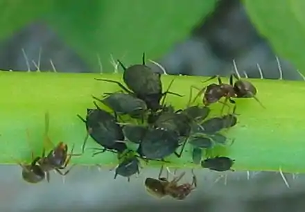 If you see a plant covered in ants, it's likely that the ants are herding aphids. They will pick up an aphid and move it to where they think they will get the best sugar. Then, when the aphid is nice and plump, they suck the sugar out of the aphid's anus.