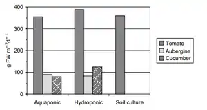 Another way to evaluate the system is to analyze the efficiency of nutrient removal by the plants. This has been done by many scientists. In one such experiment, scientists tested the nitrogen excretion and uptake in the aquaponic systems by looking at growth performance, lettuce yields and nutrient retention [27]. In another experiment, the aquaponic system was set-up to analyze the removal of nitrogen by tomatoes and cucumbers. It was found that the highest removal was by tomatoes and the overall system had “69% of the nitrogen removal by the overall system could thus be converted into edible fruits”[28]. The yields of certain crops can also be used to evaluate the productivity of the system. In Graber et al. they analyzed four different tomato crops and found their yields to be higher in aquaponic when compared to hydroponic systems (Fig. 6).