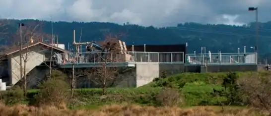 The headworks of the Arcata marsh Wastewater treatment system (above, photo courtesy of Dr. Dustin Poppendieck) consists of four main components: The influent pump, to move the water along; flow measurement channel, to measure incoming flow; bar racks, to catch large incoming objects; and grit settlement, which settles out. The headworks are named so because they are at the 'head', receiving portion, of the Arcata Marsh system.