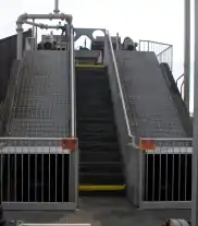 Bar racks are responsible for removing large objects that end up in the sewer system. A bar rack consists of a set of evenly spaced bars that intersect waste flow vertically. Liquid is allowed to flow between bars while larger objects cannot pass and remain stuck on the bars. To allow for flow not to be hindered by objects accumulating at the bars, the bars are cleaned by a mechanical 'claw', which can be seen in Figure 2, that removes the objects. After being removed the material is sent to a land fill.