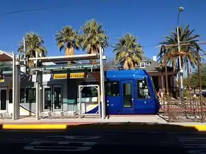 Sun Link, The Tucson Streetcar, (Wikipedia): Sun Link, also known as the Tucson Modern Streetcar, is a single-line streetcar system in Tucson, Arizona, United States. It opened on 25 July 2014, serving an estimated 17,000 riders on its opening day. The system's 3.9-mile (6.3 km) route connects the Arizona Health Sciences Center (including University Medical Center), the University of Arizona campus, the Main Gate and 4th Avenue shopping and entertainment districts, Downtown Tucson, the Tucson Convention Center, and the Mercado District under development west of Interstate 10.