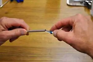 Applying epoxy to a tie rod. - Carefully dip one part of a ball bearing in the epoxy and place the wetted portion on one of the wetted aluminum tubes. Repeat with five more bearings. Unless there's a terrible mess, don't try to clean up excess epoxy - it can be removed with a sharp knife after it cures.