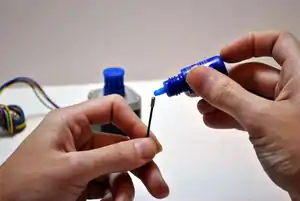 Epoxying the ball bearings to the tie rods. - Keep the excess mixed epoxy at-hand to test set, usually about 15 minutes for quick-set epoxies. Wait until the epoxy has thoroughly set or fully cured before touching the rods or turning over the rods to repeat the process with the remainder of the ball bearings on the opposite ends of the tie rods.