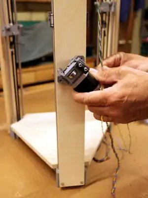 Attach vertical boards. - On the apex having all the limit switch wires, position the extruder drive about half way up the vertical board and with the fuel hose angled up and to the right (see picture). Secure in place with two #6 x 1/2" sheet metal screws.