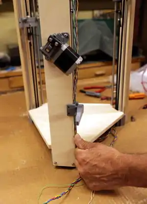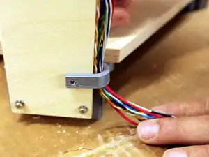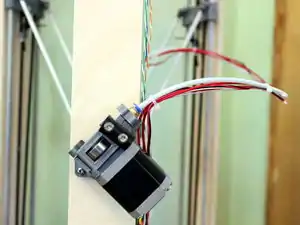 Attach the Bowden sheath. - Run all of the wires down the right side of the vertical board, pulling them towards the bottom of the frame. Secure the wires in place with the spool holder, placed about halfway between the extruder drive and the bottom of the printer. Secure the spool holder with two #6 x 1/2" sheet metal screws.