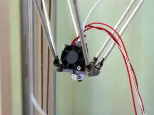 Attach the end effector. - Push the 4mm PTFE tubing into the pneumatic quick-connect on the extruder drive. Tie the fan, thermistor and hot end wires to the Bowden sheath with three or four small wire ties. Do not over-tighten the wire ties as they can constrict the Bowden sheath and block the movement of filament.