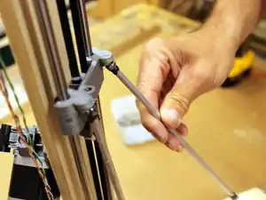 Snap carriages onto LM8UU bearings. - Insert M3 x 50 mm socket head cap screws with M3 washers through the holes in a vertical board. Push the screws through their holes in the idler and motor ends. The holes will not align with the screws if the apex isn't properly assembled, e.g. the ends aren't fully pushed onto the guide rods. Secure the board in place with M3 nuts and M3 flat washers on the idler end and only nuts on the motor end (there is insufficient clearance for washer). Repeat with the remaining two apexes.