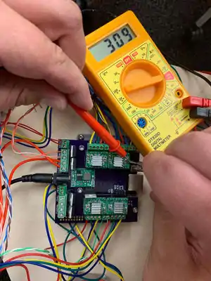 Note location of potentiometers. - With a small screwdriver and a voltmeter set for millivolt readings, adjust each of the small potentiometers on the motor controllers to produce a potential of 250 - 300 mV measured between ground (the USB socket can be used for ground) and the screwdriver used to adjust the potentiometer (see photo). Two sets of hands simplifies the task. Be careful to not short anything with the screw driver or voltmeter probe.