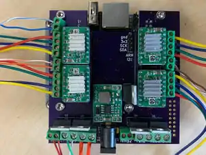 - There are three motors that control the movement of the printer. The motors are identified as U, V and W. When looking at the front, the extruder drive (with the fourth motor) is at the back of the printer. The U motor is on the left front, the V motor is on the right front and the W motor is in the back center on the apex with the extruder drive.
