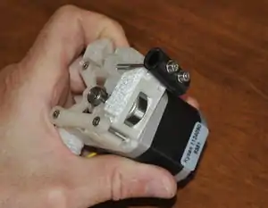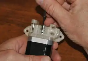 Motor with drive body properly oriented. - Start the M3 x 6mm socket head head screw in the top-left hole. Do not tighten.