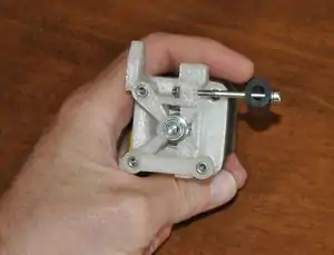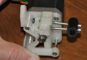 An extruder consists of two ends - a hot end and a cold end. This portion of assembly covers construction of the cold end, or extruder drive, the part of the system that pushes the filament into the hot end. The extruder drive is a pinch-wheel design wherein filament is pinched between a preloaded idler bearing and a toothed drive gear. Filament is pushed hard against the drive gear by the preloaded idler so that the teeth in the drive gear engage the filament, forming something akin a rack-and-pinion drive. The stepper motor then pushes the filament into a Bowden cable, where the filament is constrained and can only exit through the nozzle in the hot end.