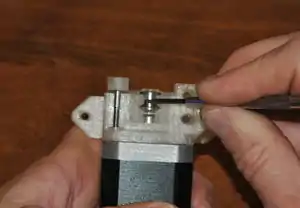 Properly positioned drive gear set screw. - Push a short piece of 1.75mm filament through the filament path and align the knurled groove in the drive gear with the filament. When the drive gear is positioned properly, hold it in place and tighten the drive gear set screw with a 1.5mm hex key.