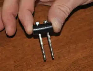 Drilling the fuel line. - Place washers on the two M3 x 45mm screws. Push one of the screws through the hole in the fuel line.
