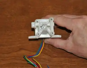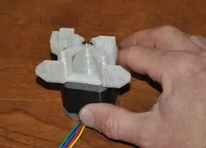Motor with drive gear and bearing. - With the motor laying on the table, wires exiting towards you, orient the printed drive body with the conical section towards you, as shown in the picture.