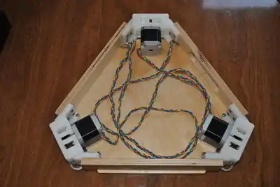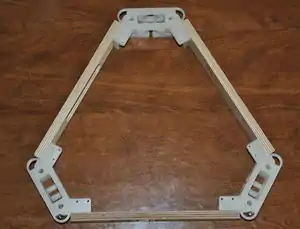 - Choose the side of the hexagonal wooden base you wish to be exposed and place that side down on the work surface. Align the motor end triangle, flanges down, over the plywood base and with the linking boards over the longer sides of the hexagonal base. Align the base and secure it with six #6 x 3/4" sheet metal screws through the holes nearest the center of the hexagonal base.