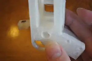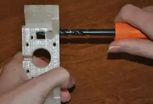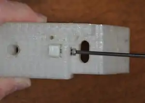 Bore through bar clamp with 3mm bit.- Put M3 nuts in the nut pockets in each of the six bar clamps. With pliers, squeeze the nuts all the way into the clamp until the face of the nut is flush with the surface of the clamp.