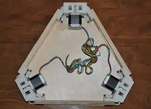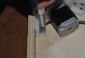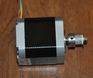 Motor ends and linking boards assembled. - Put the pulley on the motor with one set screw lined up with the flat on the shaft. Leave a gap of about 5 mm between the pulley and motor. If the pulley has two set screws, use both of them!