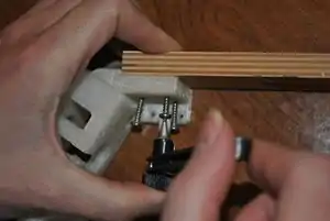 Fixing the bar clamp. - With the motor end laying with flanges down on the work surface, position a linking board so that its end is butted firmly against the end of the tab pocket. The board and motor end must be flat against the work surface. Start three #6 × 3/4” sheet metal screws into the tab and linking board but do not tighten them until the position of the board is checked – the board must be butted against the end of the motor mount tab so there is no gap between the plastic and wood and the board and motor end must lie flat on the work surface. Once in position, tighten the screws.