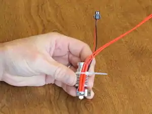 Insert cartridge heater into its pocket. - Bend the wires towards the entry of the hot end and secure in place with a small wire tie. Tighten the wire tie on the hexagonal portion just off the smooth round portion of the heat sink.