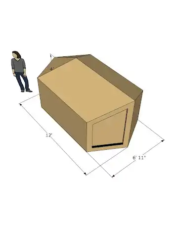 We started with a stretch 6’ hexayurt and replaced one of the half-pyramid assemblies with H13 style 6’ tall walls and flattened roof: