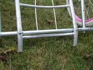A group from the Fall 2007 Humboldt State Engineering 114 course also has attempted a backpack frame trailer from these instructions! We will insert suggestions to improve replicability for those who may need a few more details to build a trailer successfully. The group members were generally all familiar with bike mechanics, though none of us had ever built a bike trailer before and did not have any particular skills in building things. However, between the four of us, we managed to build a good trailer. It helped a lot to have extra hands to stabilize the pieces while the conduit was being drilled, as well as added perspective to ensure that holes were being drilled in vertically, rather than tilted.