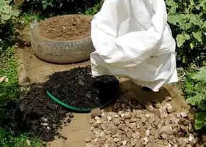 Repeat step 3 until the bag has been filled. The bag should now contain an uninterrupted core of rocks surrounded by earth all the way to the top.