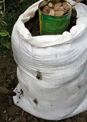 Fill the bottom of the bag or sack with soil. Place the hollow can in the middle of the soil and then fill it with rocks – this is used as the watering system for the bag garden. Water is poured over the rocks and it slowly filters through the stones, gradually watering the vegetables without flooding them.