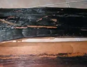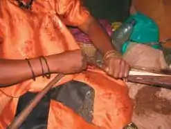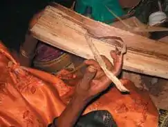 The outer sheath of the trunk is composed of tightly covered layers of fibre. The fibre is primarily located adjacent to the outer layer and can be peeled off in strips of 5 to 8 cm wide and 2-4 mm thick.[4] The stripping process is known as tuxying the strips, which are referred to as tuxies. Once the tuxies are stripped from the sheath, they are bundled and brought to the stripping knife for cleaning. In this process, the tuxies are pull under a knife blade. The blade is pressed tightly against a wood or stone block in order to scape away the plant tissue between the fibres. The bundles of clean fibres are then hung to dry. Basic machines can also be used as an alternative to hand stripping. They consist of two rolls, of which one is fitted with a scrapping blade. Once the darker outer sheath has been removed from the trunk, it is cut into sections of approximately 120 to 180 cm in length. These sections are fed through the revolving drums. The scrapping blade scrapes the pulpy tissue away. The pulp can then be dried and used in the same manner as the tuxies.