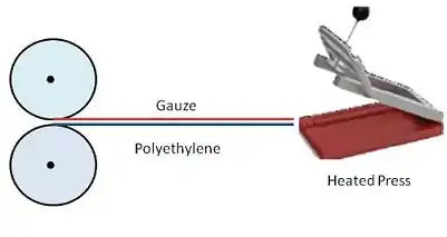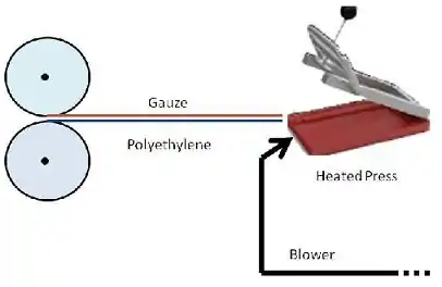- Place the polyethylene, fibre, gauze arrangement on the heating press. Clamp press to bond the polyethylene and gauze together.