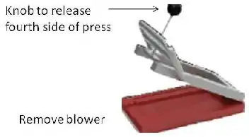 4) When the pad is full, labourer #1 flicks the switch off and removes the blower's nozzle. The labourer then modify the press to include a 4th side and flick another switch to seal the final side of the pad.
